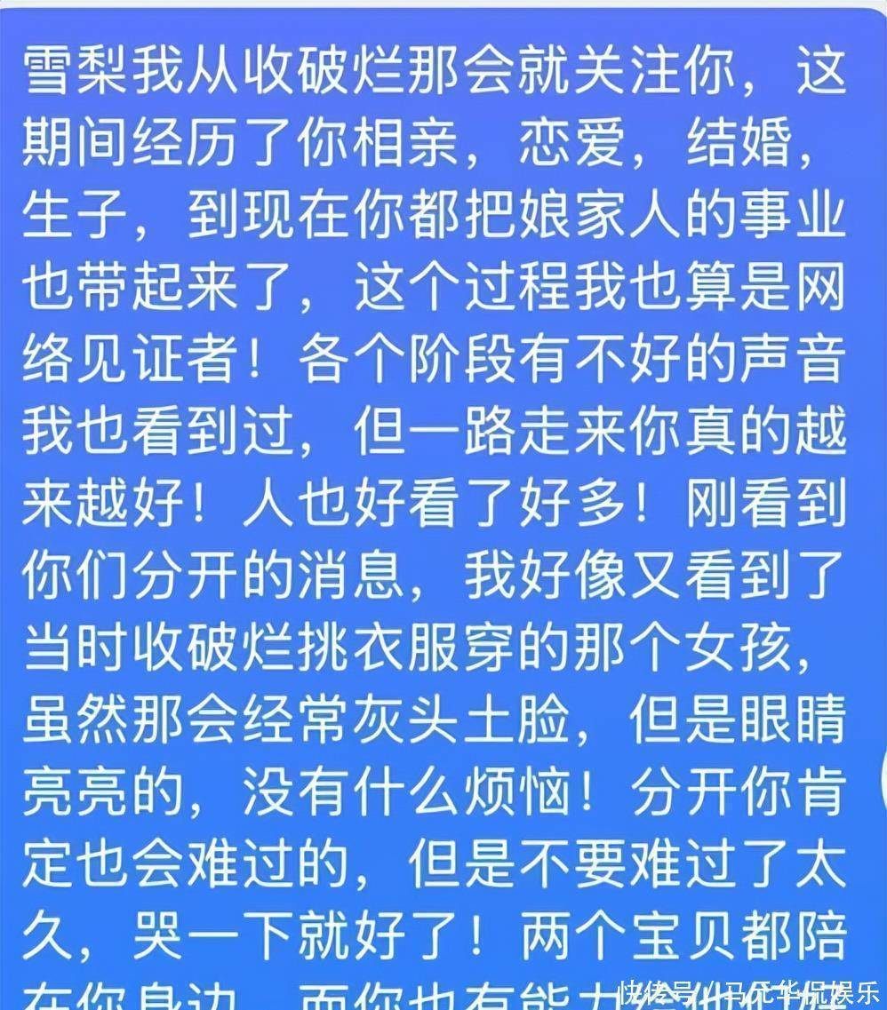王雪梨和潘兵的分开也是一度登上了热搜,曾经支持他们的粉丝朋友们不禁感慨太让人唏嘘。有的网友留言道:“雪梨,我从收破烂那会就关注你,这期间经历了你相亲,恋爱,结婚,生子,到现在你都把娘家人的事业也带起来了,这个过程我也算是网络见证者!......分开你肯定也会难过的,但是不要难过了太久,哭一下就好了!两个宝贝都陪在你身边,而你也有能力给他们好的生活该遗憾的不是你!也有的网友则评论道:“我是真的没想到王雪梨和潘兵分开了,不管是不是真的,都为他们而感到可惜,毕竟是两个孩子的爸爸妈妈了!希望王雪梨今后过好自己的生活,不要想太多!不管怎么样,希望大家过好自己的生活!